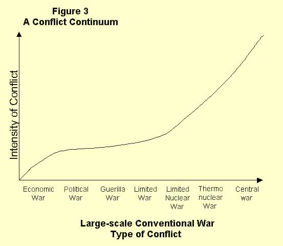 It is fashionable to portray conflict as a kind of continuum. This portrayal assumes that the intensity of conflict has some kind of measurable dimension; so long as this assumption is not taken too seriously, the continuum can be a useful conceptual tool. However, various conflicts can take place simultaneously at many points along the scale. The Soviets may be engaged, through proxies, in guerrilla and conventional war operations against the United States and her allies; conducting a trade and economic offensive, either openly or through other proxies; fully exploiting the illusion of arms reduction, offering numerous diplomatic ploys; fomenting subversion, sabotage, and terror in limited areas; and engaging in the Technological War through research and development, weapons construction, intelligence, and disarmament propaganda. All these events have been occurring over the past decades and are, in fact, occurring at this time. It may be useful to visualize some particular local operation, or phase, as being at one or another point on the spectrum of conflict, but it would be fatal to assume that because we are at a particular point on the escalation ladder we cannot be at three or four others as well. It would be particularly unhealthy to assume that because the U.S.S.R. is deescalating one or another limited operation as in Afghanistan in 1988 that is being fought with gunpowder weapons, they have also abandoned the Technological War.