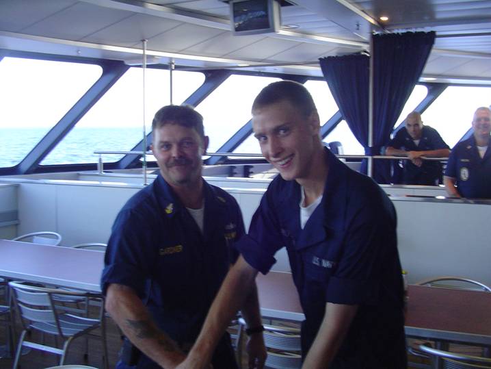 While transiting the Atlantic Ocean HSV-2 Swift celebrated the United States Navy’s 230th Birthday. In the theme of the Secretary of the Navy’s birthday message, HSV-2 Swift has been on the cutting edge of Naval operations, particularly Disaster Relief and Humanitarian Assistance. Last January HSV-2 Swift provided logistics support for Tsunami relief efforts in the Gulf of Thailand and just last month was shuttling critical supplies up the Mississippi River to Naval Units supporting relief operations in New Orleans. Pictured are the oldest and youngest members of the Swift crew, ENCS Gardner and ENFN Royalty. In keeping with Swift’s modern high speed, low drag motif, they are cutting the ship’s Birthday Cookie.